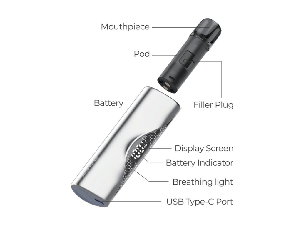 V těle e-cigarety se nachází integrovaná baterie s kapacitou 850mAh pro dlouhé hodiny nerušeného vapování bez potřeby častého dobíjení. S touto kapacitou hravě zvládnete také intenzivnější vaping. Pro účely nabíjení je zařízení vybaveno portem USB-C s podporou nabíjení proudem až 1A.